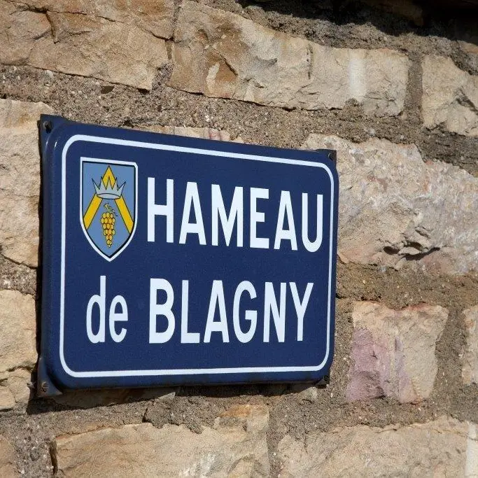 La petite route goudronnée descend au milieu du vignoble . Passer près de la “Chapelle Saint Charles” de 1740 (la sculpture a disparu).Tourner à droite afin de traverser le hameau de Blagny . Après les premières maisons, en suivant la route tourner à gauche puis à droite (poteau P36).